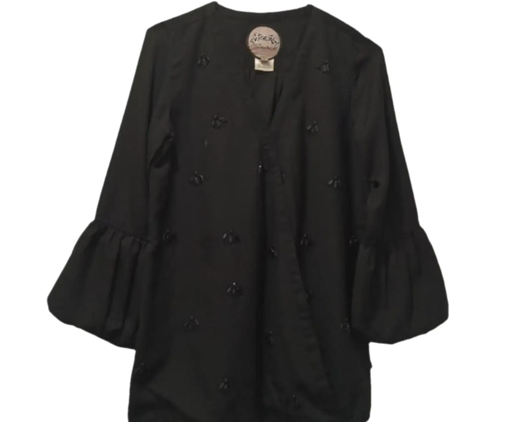 Este icónico vestido negro destaca por su vibrante bordado floral en el pecho y un corte favorecedor que lo convierte en la pieza preferida para eventos de día y cócteles.